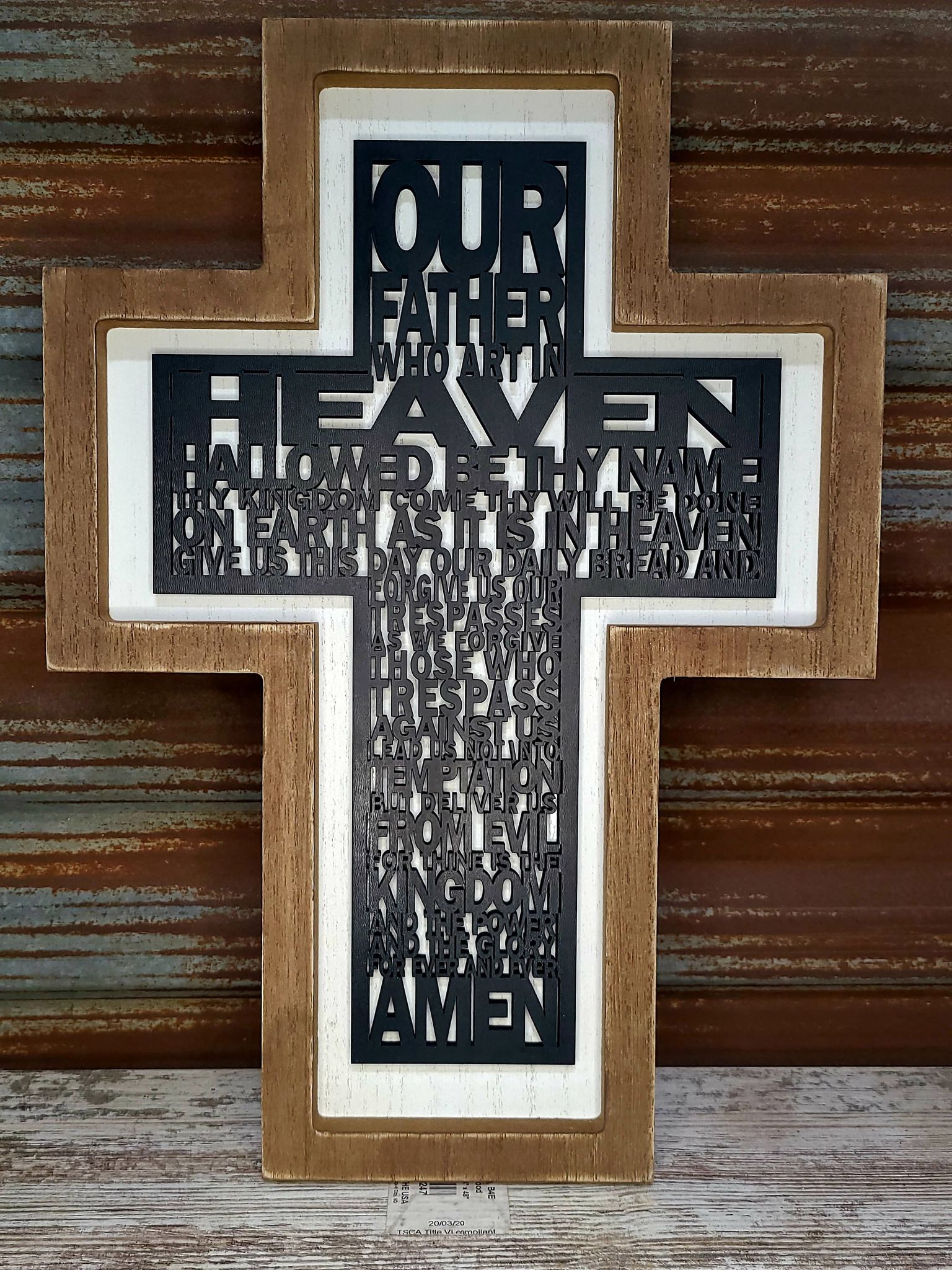 The Lord's Prayer White & Brown Wood Wall Cross is made of solid brown and white MDF and features a brown frame and a whitewash interior panel.