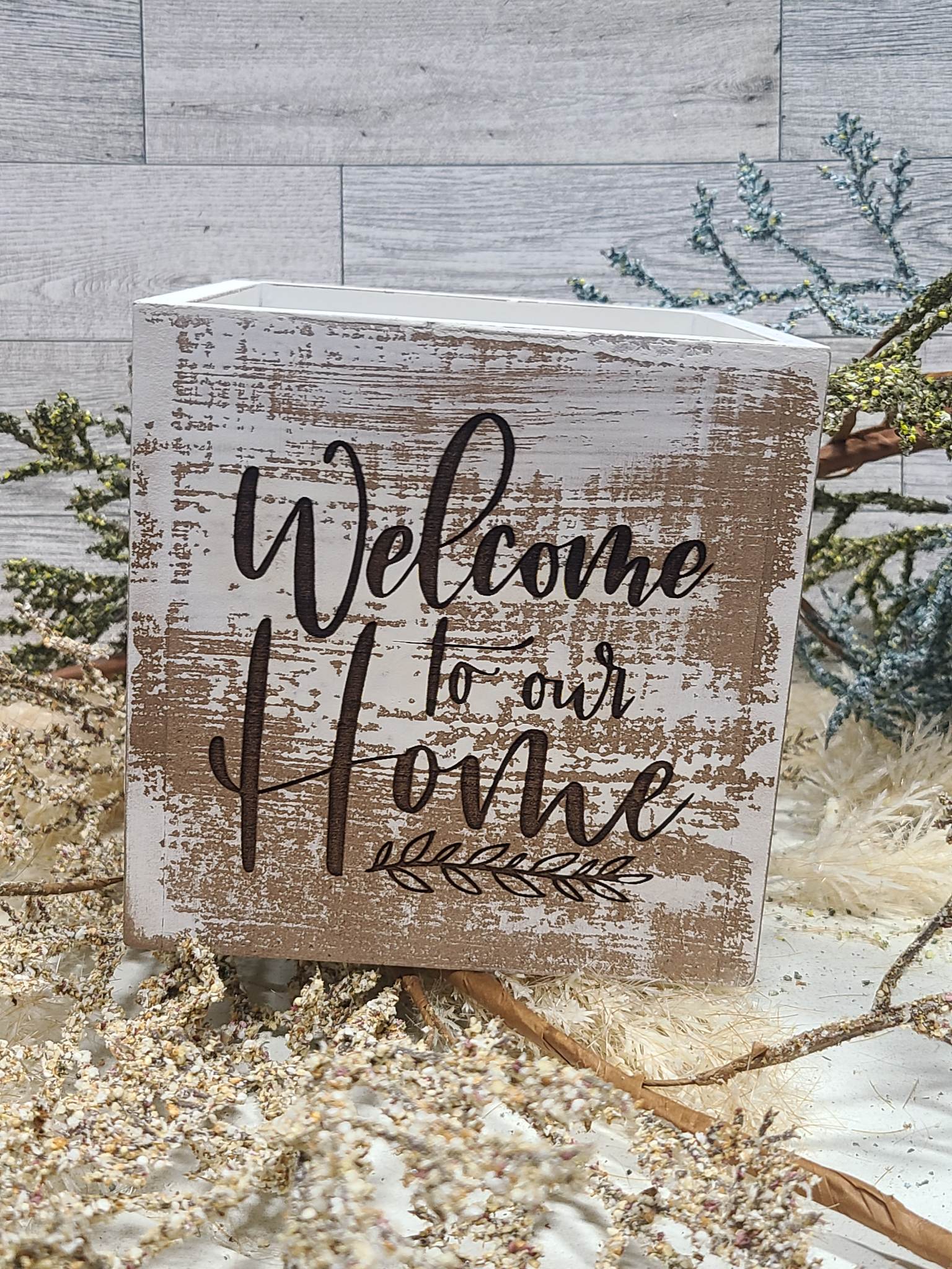 Your house will be dressed from floor to ceiling with beautiful decor like Whitewash Wood Container to hold your utensils. This laser engraved square MDF piece is stained a white washed shade to coordinate with your decor and ready to fill with whatever you see fit.