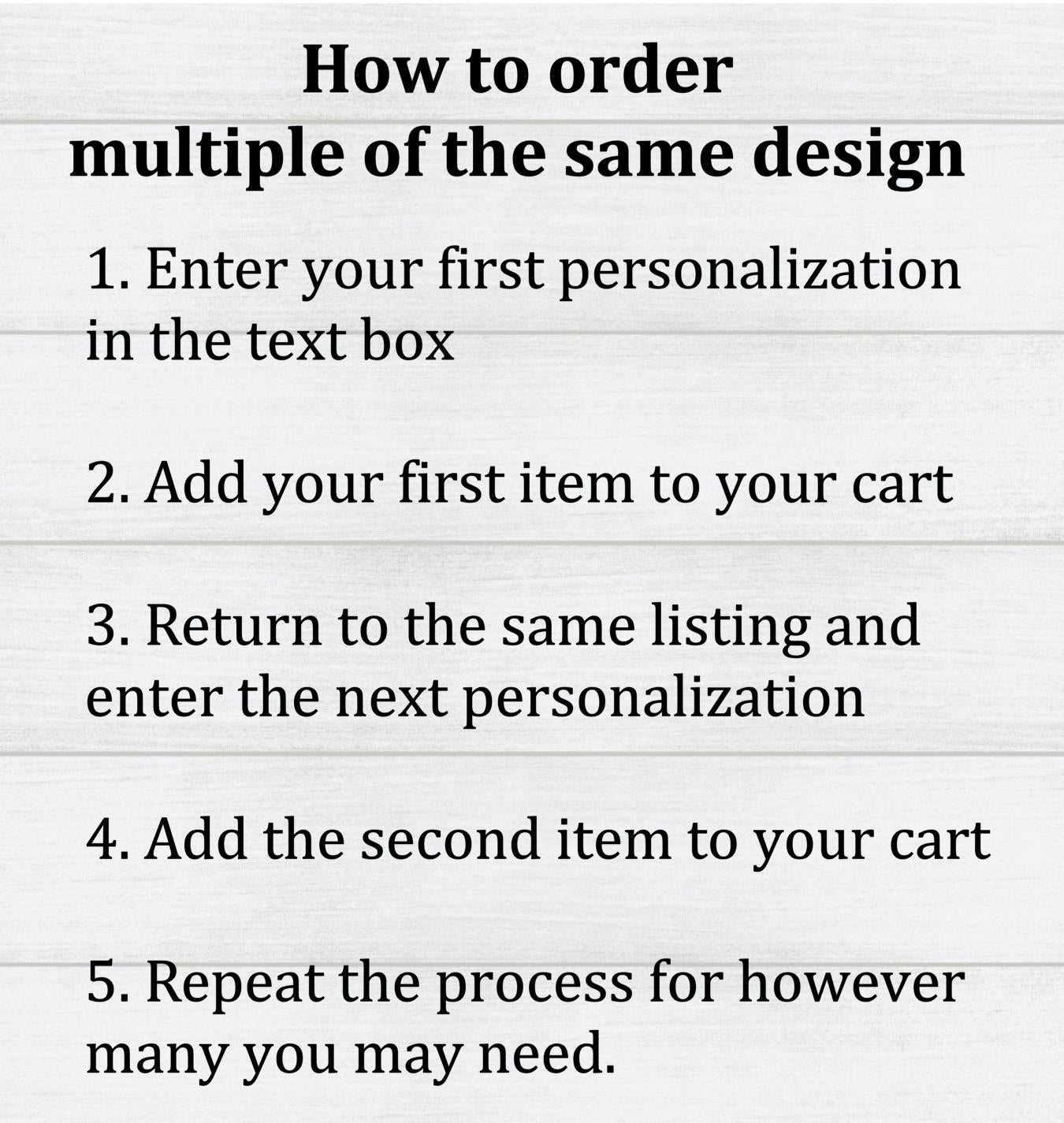 ***Every customization needs to be added individually to cart. Please do not add a quantity of more than one to your cart at a time (unless you would like them to all read the same) as only one personalization can be put in order at a time***